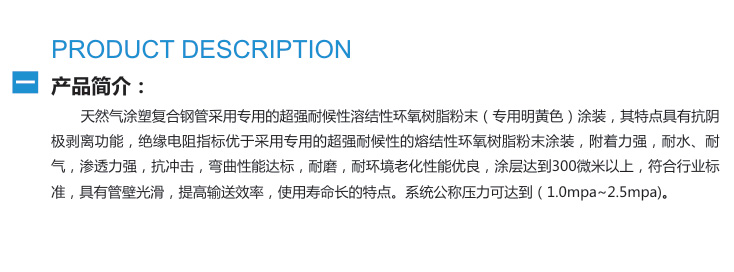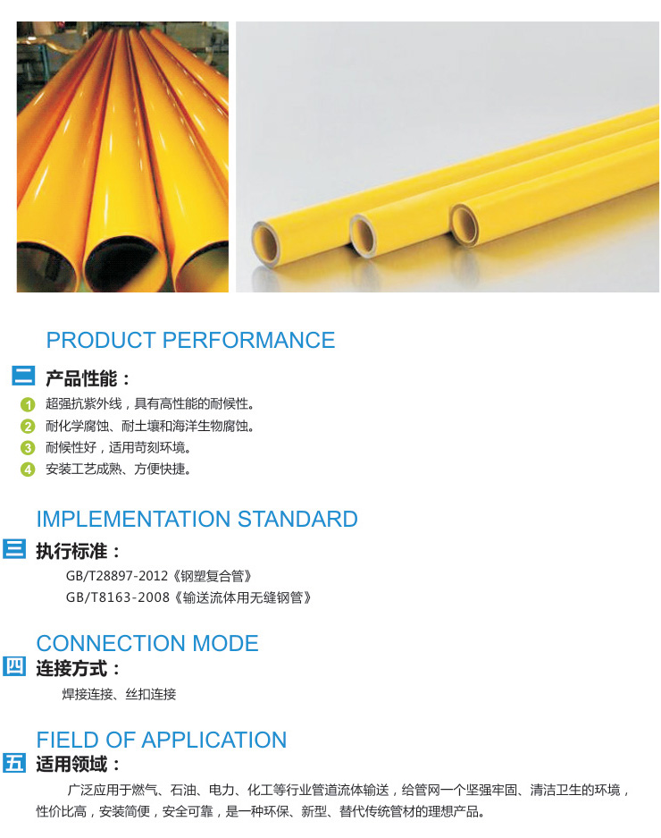 天然氣涂塑復合鋼管采用專用的超強耐候性溶結性環(huán)氧樹脂粉末(專用明黃色)涂裝,其特點具有抗明廢剝離功能,絕緣電阻指標優(yōu)于采用專用的超強耐候性的熔結性環(huán)氧樹脂粉未涂裝,附著力強,耐水、耐滲透力強