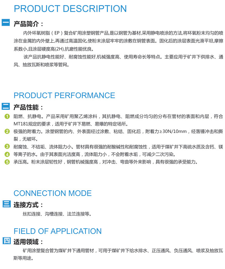 內外環氧樹脂(EP)復合礦用涂塑鋼管產品,是以鋼管為基材,采用靜電噴涂的方法,將環氧粉末均勻的噴涂在金屬的內外壁上,再通過高溫固化,使粉末涂層牢牢的涂敷在鋼管表面。