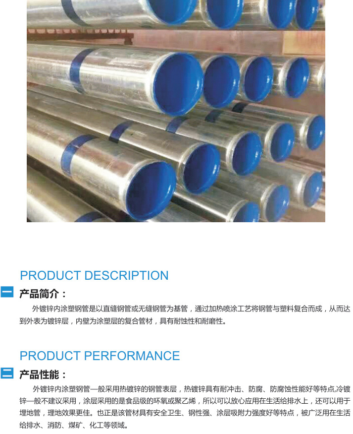 外鍍鋅內涂塑鋼管是以直縫鋼管或無縫鋼管為基管,通過加熱噴涂工藝將制管與理科復合而成,從而達到外表為鍍鋅層,內壁為涂塑層的復合管材,具有耐蝕性和耐磨性。